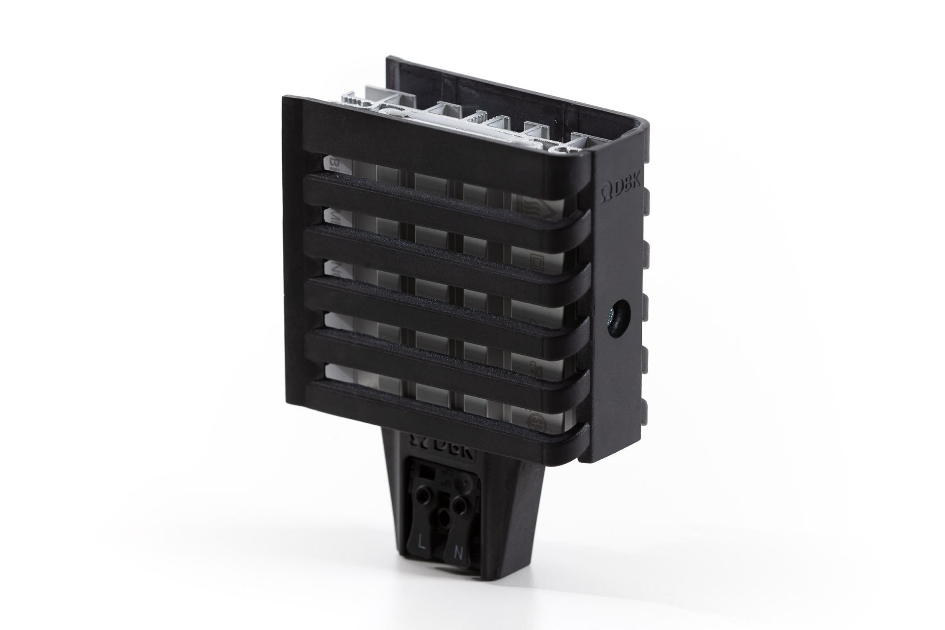 The heater features a durable, flame-retardant plastic housing (UL 94V-0) and is equipped with an integrated terminal block for quick and easy installation. Thanks to the 35 mm DIN rail mounting system, it fits seamlessly into various industrial and commercial setups. Despite its small size, the Nimbus NG 20 W ensures even heat distribution and maintenance-free operation.